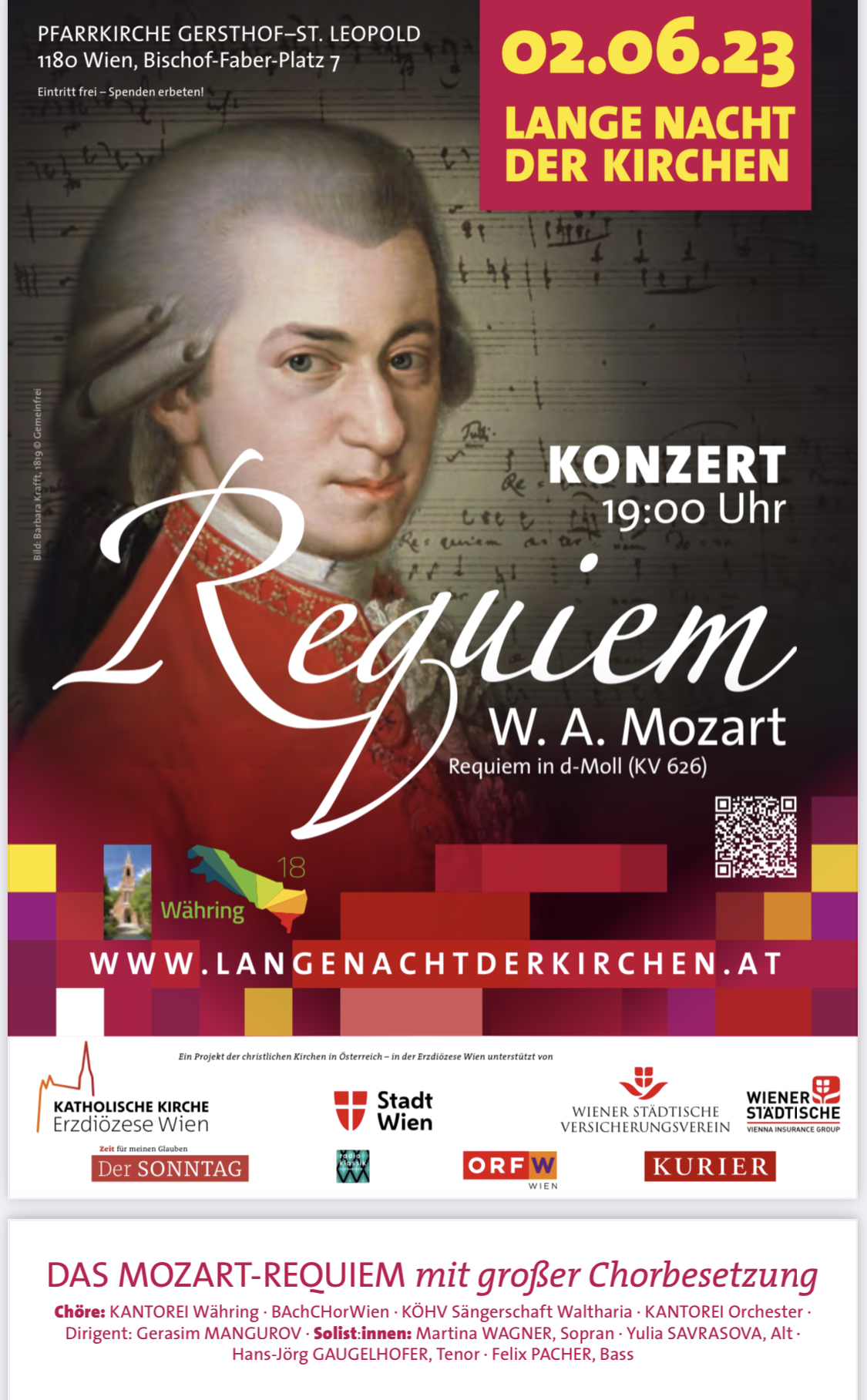 Lange Nacht der Kirchen, Requiem, Mozart Alto solo: Yulia Savrasova Conductor: Gerasim Mangurov + Add to Google Calendar + iCal / Outlook export Date Jun 02 2023 Expired! Time 7:00 pm - 9:00 pm Location Pfarrkirche Gersthof-St.Leopold Vienna, Austria Category Past Events Share this event